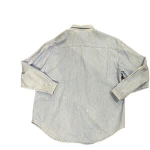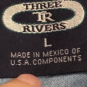 Vintage Three Rivers denim shirt in women's size large. This unique piece features vintage quilt pieces and doilies, adding a touch of charm and individuality. The shirt is made from high-quality denim and is in excellent condition. Perfect for adding a bohemian or eclectic touch to your wardrobe. Don't miss out on this one-of-a-kind item! This is a pre-owned item.