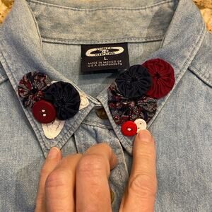 Three Rivers Womens Large Vintage Denim Shirt with vintage quilt pieces/doilies