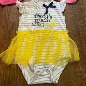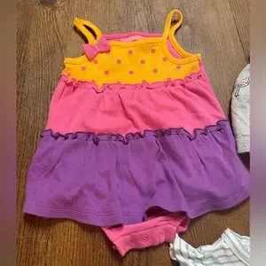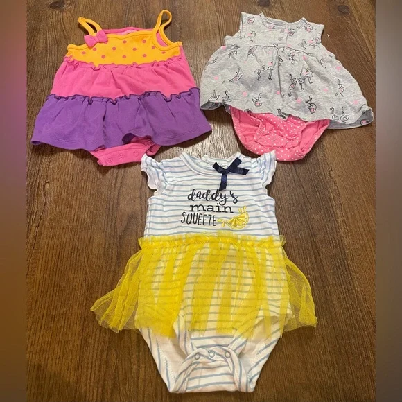 Three Rompers. One is Brand New With Tags. Girls Size 6 Months.
