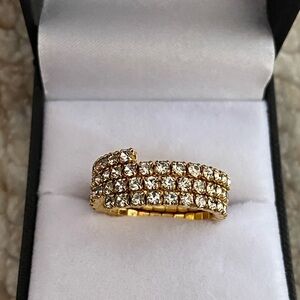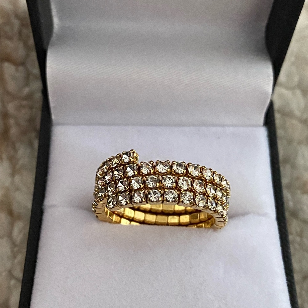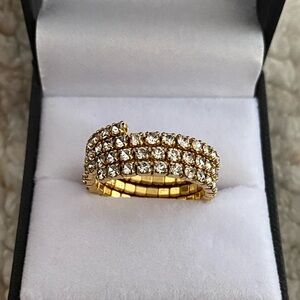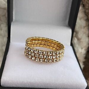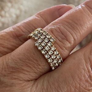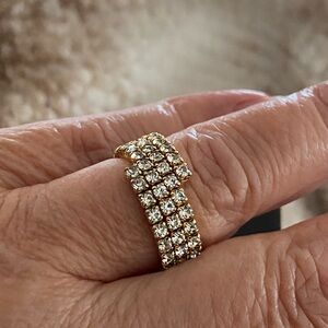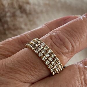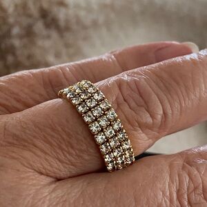 Three rows rhinestone crystal golden stretch tennis band ring, size 7 , the ring 8mm wide.