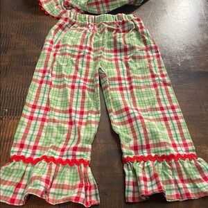 These charming plaid kids pajamas feature a delightful red and green pattern with playful ruffle trim. Perfect for cozy nights, these pajamas offer comfort and style for your little one. Missing a button see last picture, you could easily move the top button down to fix this or get a replacement one. I have a set of 12 month old same style if you have 2 girls close in age
