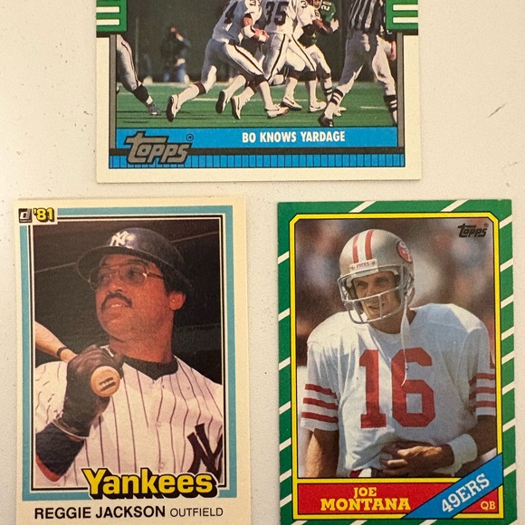 Three Sports Trading Cards: Joe Montana, Bo Jackson (Football), Reggie Jackson