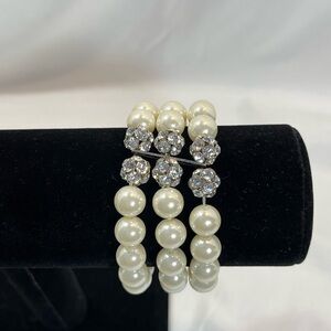 Three strand faux pearl bracelet. Bracelets connect by rhinestones balls. Stretches to fit any size wrist