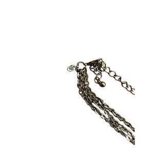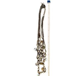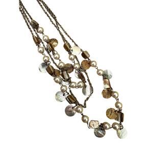 Mother of pearl beads and shell discs mix with faux pearls and silvertone chains to create this three strand necklace. It has a hangtag that reminds me of the tags for Park Lane, but no other tags or maker's marks. The necklace is adjustable and in such light white and earthy tones it goes well with a light beach vibe on a hot night. Measures 24” on the longest strand/setting.