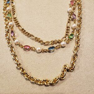 Three Strand necklace and pierced earring set. This is a pretty set in gold with faux pearl and colored rhinestone stations. It is coming from a smoke free, pet friendly home and in excellent condition.