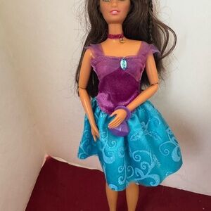Barbie #1 has articulated arms and is wearing a purple and turquoise dress with heels and purse.