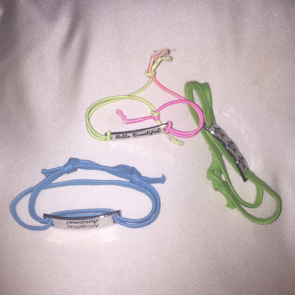 One: pink and green-yellow bracelet that says “hello beautiful”