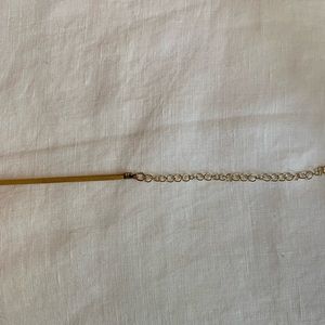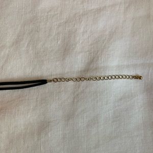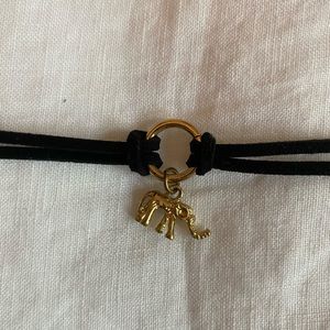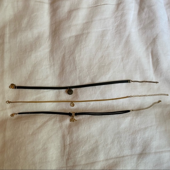 Three super cool chokers. A charcoal colored one with a sparkly stone pendant, a tan colored one with a diamond detailed gold pendant, and a black double lined one with a gold elephant pendant. All are gently used and in great preowned condition. They all have long chains to adjust to fit any size!