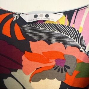 Features a colorful pattern with shades of red, pink, orange, yellow, and purple