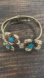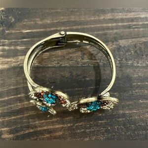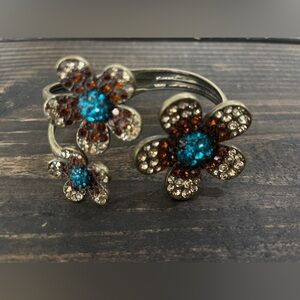 This bronze bracelet set features three unique flower designs, each adorned with sparkling gems for an added touch of elegance. This bracelets are in excellent used condition, perfect for adding a touch of glamour to any outfit.
