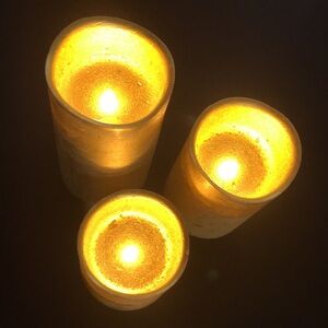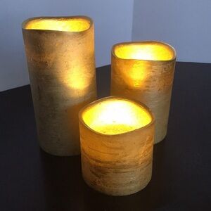 Three gorgeous gold flameless candles. Stationary white wick emits a nice warm glow that lights the top of each candle. Gold metallic–look wax exterior. Each candle takes three AA (1.5V) batteries (not included). On/off/timer switch at bottom of each candle. Each measures 4” in diameter. Heights are roughly 4”, 6”, and 8”. Add a touch of elegance to any room in your home!