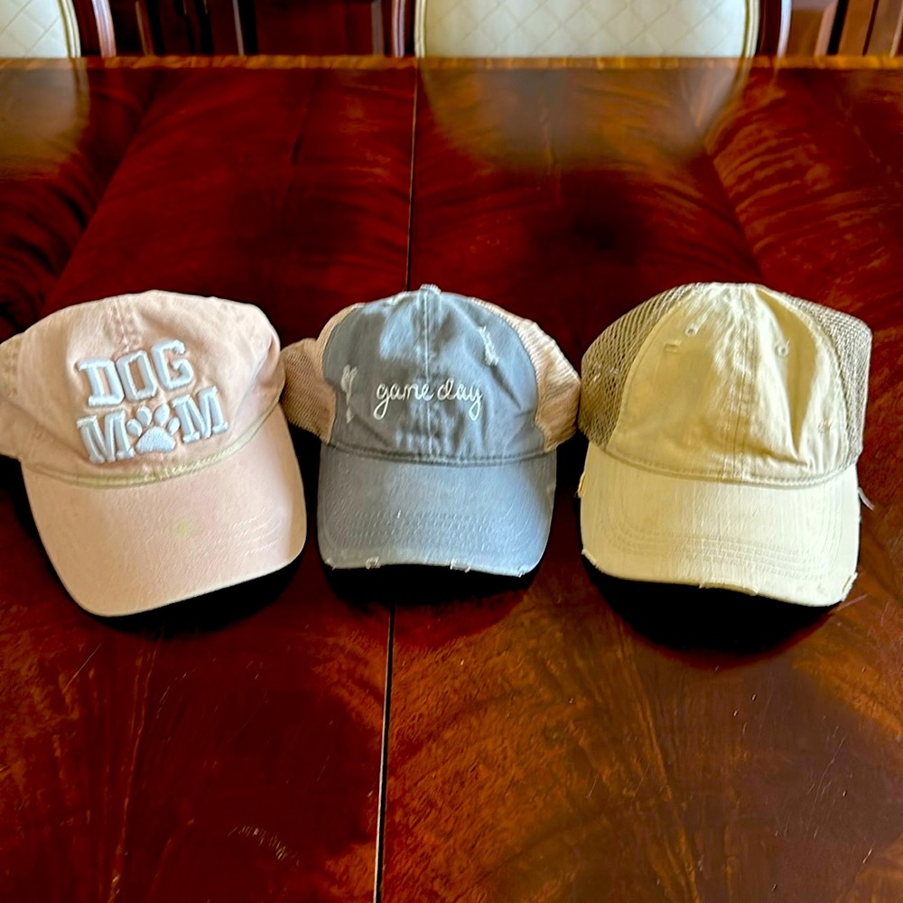 adorable hats for every day use the game day and beige hat are made for ponytails so you can slip the ponytail right through and the dog Mom hat is adjustable all adorable just cleaning out my closet and trying to get rid of things all in good condition