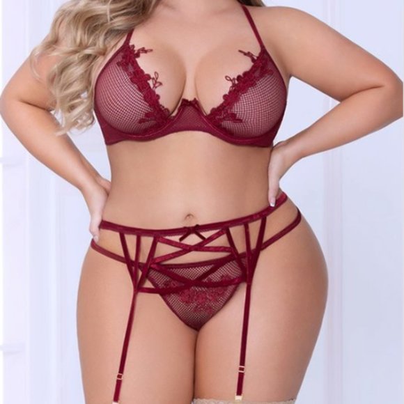 Three piece bra set. Lace and netting long line bra with attached harness, underwire, adjustable straps, hook and eye closure, garter belt, and open crotch thong.