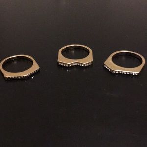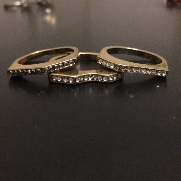 Three gold colored rings encrusted with gems. Can be sold as a group for five, or one individually for two dollars each.