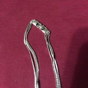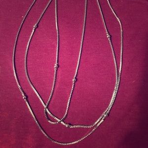 Silver necklace that is simple and chic. Has cute little beads to break up the tiers.