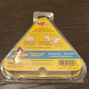 Engage young learners with these Trend Enterprises Three-Corner Flash Cards, perfect for mastering addition and subtraction facts. This set includes 46 two-sided cards, designed for ages 6 and up, offering skill-building and test prep opportunities. The unique three-corner design allows for self-checking and interactive individual or group play, with problems on each corner and the answer hidden under your hand. Teacher-created and child-tested, these cards cover all facts 1-12, enabling practic