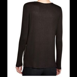 Three Dots Jamie Metallic Stripe Top. Round neckline, long sleeves, striped metallic front. Solid black knitted sleeves and back, pullover style. Fabric Content: Viscose/metallic fibers. Country Of Origin: Made in USA.Product Care: Dry clean. Color: metallic