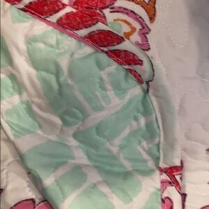 Colorful pink green orange cream colored three piece quilt set for king size bed. Reversible