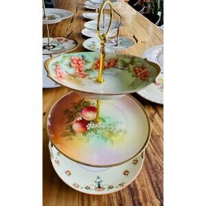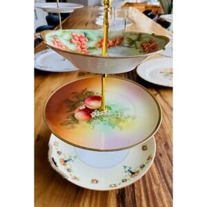 Material: Genuine vintage china (each piece shows gentle signs of previous love and use). Slight imperfections may exist, adding to the unique charm and authenticity of the stand. The plates are complemented by gold-tone hardware that enhances the vintage aesthetic.