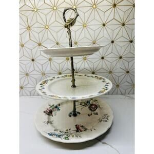 Material: Genuine vintage china (each piece shows gentle signs of previous love and use). Slight imperfections may exist, adding to the unique charm and authenticity of the stand. The plates are complemented by rubbed brass tone hardware shaped like a vine that enhances the vintage aesthetic.