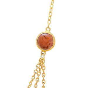 Three-Tiered Gold Tone Necklace With Amber Stone Accents 30 Inches Long Statement Jewelry. This breathtaking and elegant design features three layers of cascading gold tone chains, each adorned with captivating amber-colored stones, radiating an understated vintage charm. Each stone is bezel-set, adding to the timeless aesthetic, while the gold tone chain highlights the delicate craftsmanship. The adjustable lobster clasp provides versatility in length to suit your preference. This piece makes for a striking statement accessory, perfect for complementing formal or casual attire. With its timeless design, this necklace evokes the grace of vintage jewelry eras, making it a treasure that transcends fleeting trends. Whether worn to accessorize an everyday outfit or as a glamourous addition to evening wear, this necklace is a true testament to enduring beauty.