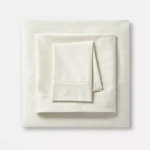 Give your bed a new look and feel with a 400-Thread Count Solid Performance Sheet Set from Threshold™. Cut from 100% cotton fabric with a thread count of 400 and a sateen finish, this bedding set creates a perfectly luxurious sleeping space, and the solid-color design mixes well with a wide variety of styles for easy integration into your bedding ensemble. Wrinkle-, pill- and shrink-resistant construction keeps these sheets looking their best, while top and bottom labels make placement a breeze. Simply pair with your choice of comforter or quilt and a bank of pillows for a bedding upgrade that will have you counting the minutes until bedtime.