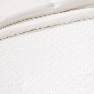 The Suffolk Clip-Jacquard Comforter Set will dress up your bedroom with lasting comfort and elegance. Crafted from a prestine white midweight jacquard fabric, this set features a unique clipped construction that features a mix of geometric patterns on all pieces to showcase texture. Plus, the white bedskirt adds the perfect finishing touch. Oeko-Tex Certified & machine washable for easy care.