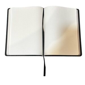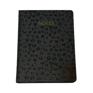 Stylish black notebook with leopard print. Features elastic band and ribbon bookmark. Perfect for notes and journaling.