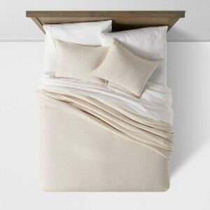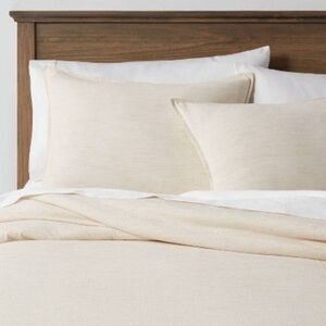 Elevate the aesthetic appeal of your bedroom with the Space Dyed Duvet & Sham Set from Threshold. This decorative duvet set includes one full/queen duvet cover and two standard shams, each crafted from a soft fabric blend to ensure you stay cozy and comfy as you take a nap or sleep through the night. Featuring a subtle space dyed design, this duvet cover and sham set easily blends with your existing bedroom decor, while giving you an array of choices to decorate your sleeping nook. Simply toss contrasting shams and pillows, and add printed percale sheets to create an inviting resting space.Threshold: Looks like home, feels like you.