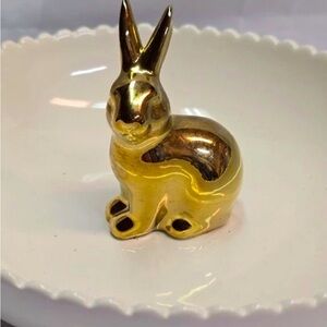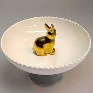 The ivory scallop edged bowl is 8” in diameter- the gold plated bunny is 2” high.