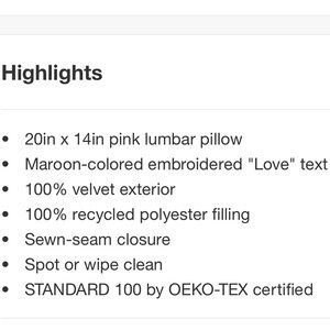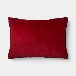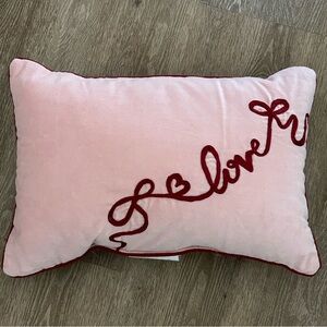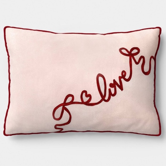 New Threshold charming pillow with love script design. Red embroidered script on pink background. Soft and cozy velvet feel.