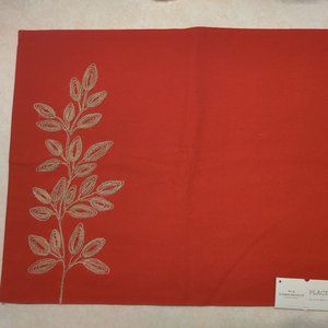 Placemat 3 - Red with embroidered gold flowers. Front 100% cotton, Back 100% polyester. Spot clean.