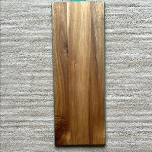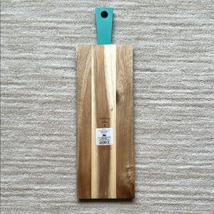 Stylish wooden cutting board with a teal handle. Perfect for entertaining, dining and kitchen use.
