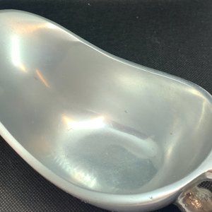This thick and sturdy polished aluminum serving dish is designed with quality and design by Threshold. Made in India. Hand Wash Only. The Makers Mark and additional statements are stamped into the bottom of the dish. The bowl is 9 ¼inch long by 2 ¾ inch high. Material Metal