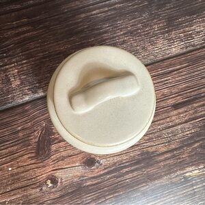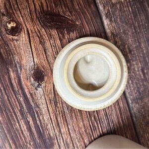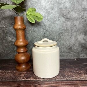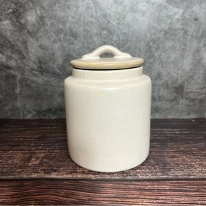 Threshold: Studio McGee Cream Canister. Crafted from ceramic, this lidded canister features a cream color with brown hues along the rim and lid for classic appeal. This ceramic canister is suitable for a variety of decor styles.