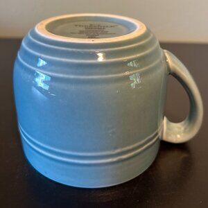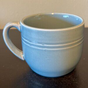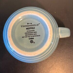 Robin eggshell blue stoneware mug in the Westfield pattern from Threshold features embossed detailing around the silhouette and at the base. Comfortable curved handle. Has a nice heavy pottery feel to it. Dishwasher and microwave safe. Measures 3.5” tall with a 4” diameter; 5” across including handle. Holds 15 fluid oz.
