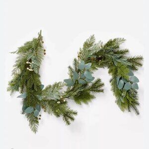Add a seasonal touch to your home with this Mixed Green Holiday Artificial Garland from Threshold? designed with Studio McGee. This holiday garland features green pine and cypress tips and is covered with eucalyptus leaves and white berries for a Christmas-themed look. The artificial construction requires no watering and stays beautiful at all times. Suitable for indoor use only, you can hang it above your mantel or on your doors and walls for a welcoming accent piece.Threshold? designed with Studio McGee: Looks like home, feels like you.