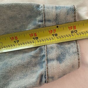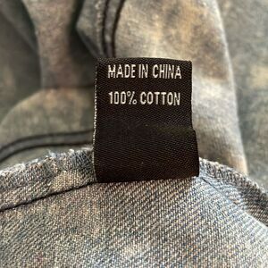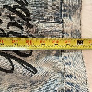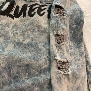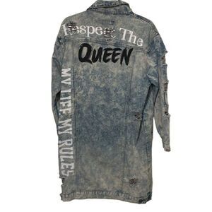 Distressed, acid wash, 100% cotton, denim, long sleeve, "Respect the Queen" graphic print duster, jean jacket by THRILL in a women's size medium. Front buttons. Unlined. Machine washable. Approximate measurements shown in photos. In good pre-owned condition.