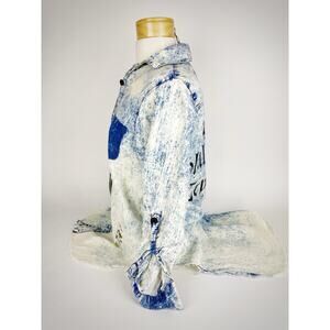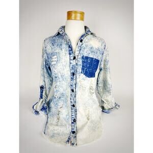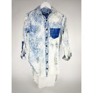 Thrill Jeans lightweight denim Tunic Dress that is perfect for upcoming Spring / Summer weather! Cool distressing and bleaching throughout, with additional stain spots, but seems to be intentional with the overall distressing look. Cannot say for certain if it is or not. Either way, it has a faux dark blue square on the front to mimic a pocket, and a large soft print on the back that says "Thou shall not try me". Sleeves are long sleeve, but with the loop button it can be made into 3/4 sleeves instead. Can be worn as a dress, or leave buttons open and wear it as a long lightweight jacket / top. (PLEASE SEE PHOTOS!)