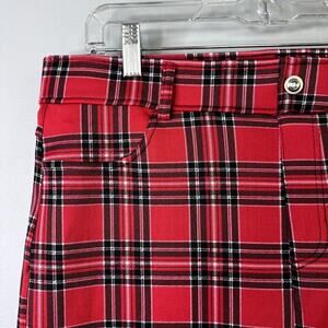 Thrill Jeans Red Black Plaid Skinny Leg Pull On Stretch Jeggings Women's Size 3X. Red, black and white plaid stretch jegging pull on pants. Flat front, faux pockets and faux fly and decorative rhinestone button in front. Functional pockets in rear. Rhinestone embellished hardware. Functional belt loops.