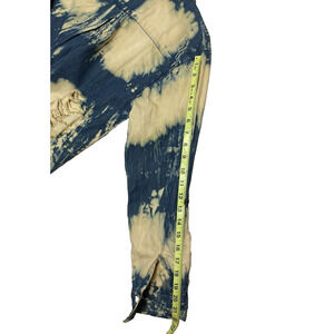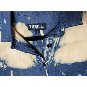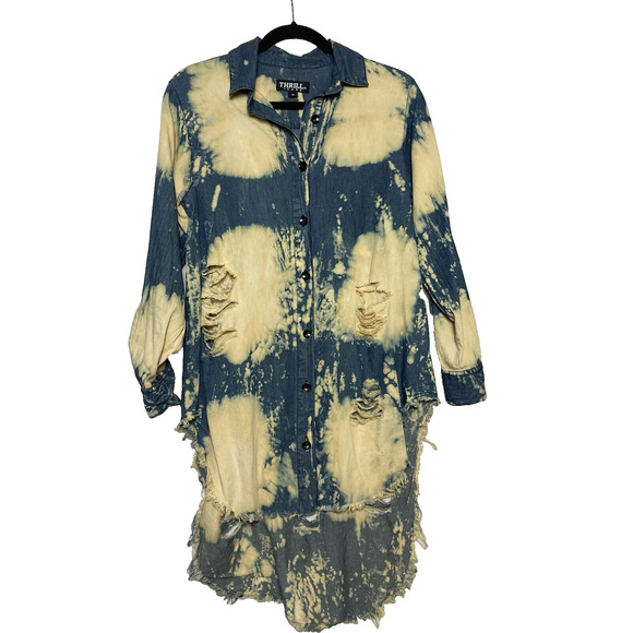 Women's size Medium ,Thrill Jeans shirt; it has a button front, bleaching, and distressing. It is a "Hi-Low" style, with the back being longer than the front. This shirt is 100% cotton and has long tab sleeves that can be worn long or rolled up. This garment is pre-owned and in good condition. Care is machine wash. This item is from a non-smoking home.