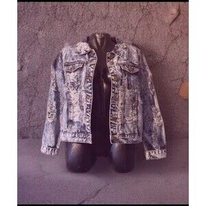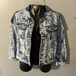Thrill Women's Jean Jacket 1X Blue Denim Factory Destroyed Acid Wahed Cowgirl Wild Please Read It Says 2x Fits Like XL
