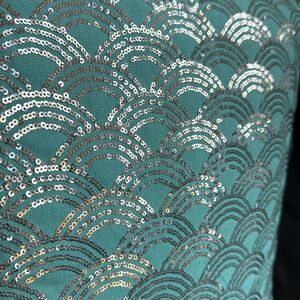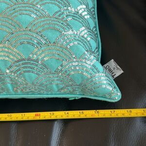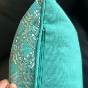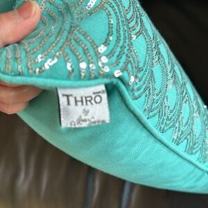 Gorgeous color sort of turquoise green pillow with silver sparkles sequins in the shape of fans. Has a zipper for easy cleaning. About 17” square. By Thro by Marlo Lorenz. Back is solid green canvas, has two faint lines but totally not noticeable, see last two photos.