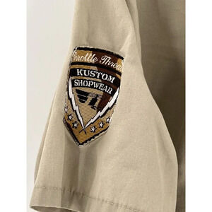 Elevate your streetwear game with this Throttle Threads Camo Skull Shirt in size 2XL. The shirt features a brown cotton blend fabric with a polyester/cotton accent, perfect for all seasons and easy to care for. The collared neckline and short sleeves provide a classic fit, while the button-down garage shirt style and patch accents add a touch of personality. This shirt is perfect for men who want to add a streetwear flair to their wardrobe. The solid pattern, easy care, and breathable fabric make it suitable for any season. The shirt is machine washable and was manufactured in Honduras. Get your hands on this Kustom Shop Gear now!