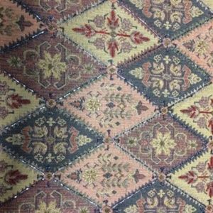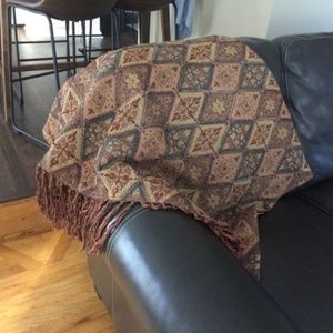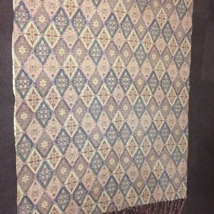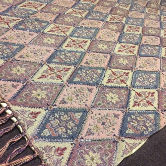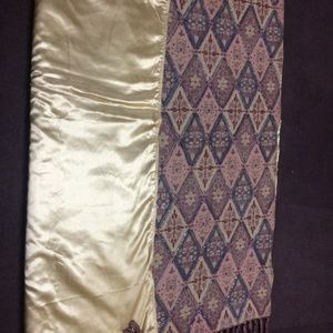 Decorative multi-colored throw with shiny dark gray beading and tassles on both ends. Reversible side is gold satin.