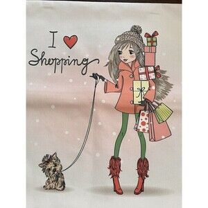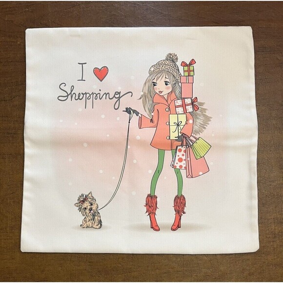 I Love Shopping Throw Pillow Cover Cute Girl With Dog Puppy On Leash 16.5” X 16.5”. New without tag! It has light impression on the top from hanging; should smooth out when stuffed! Thank you for stopping by!