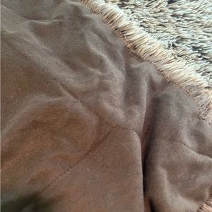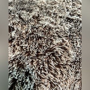 Really soft shag type on one side that is a off white/cream and brown and a microfiber suede on the other side that is solid brown. So comfy. Not too light and not too heavy.
