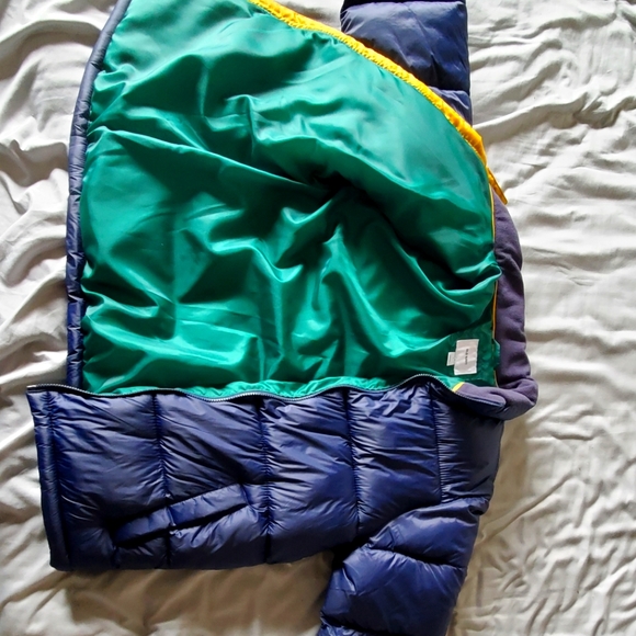 Throwback blue puff jacket with green inside lining. Size is Large in mens and has not been worn!