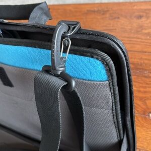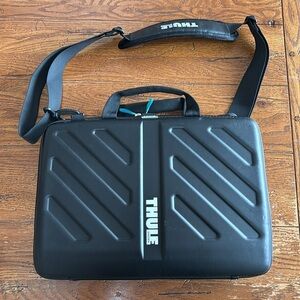 Keep your essential devices protected with this weather-resistant Thule Gauntlet TMPA-115BLACK attaché case, which is compatible with 15” Apple MacBook and MacBook Pro and features a nylex-lined pocket for your Apple iPad®. With neatly separated dividers you can easily store many items with your Macbook, allowing you to carry everything in one secure bag. Gently used with some exterior dings and scuffs but clean-new interior.