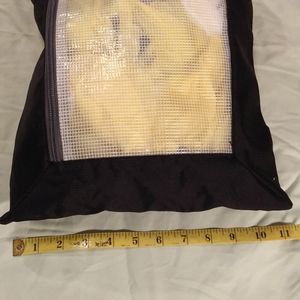 Measures 18" x 11". Top closure is a roll down with a strap and metal buckle. Zipper on long side. Reinforced semi-transparent window. Handel on back top side.
